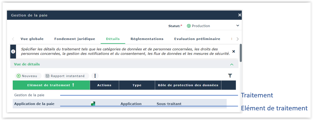 Cependant, si un traitement implique une application informatique ou un sous-traitant, vous pouvez définir des éléments de traitement afin de le décrire plus finement.