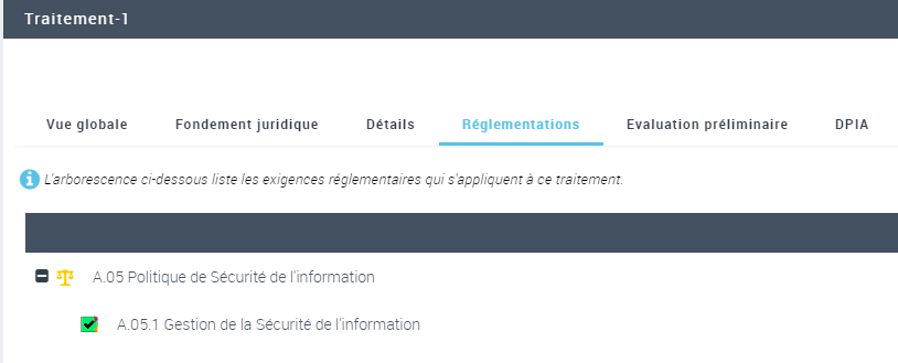 Une arborescence affiche les réglementations et exigences qui s'appliquent au traitement. Cette arborescence est en mode lecture seule.