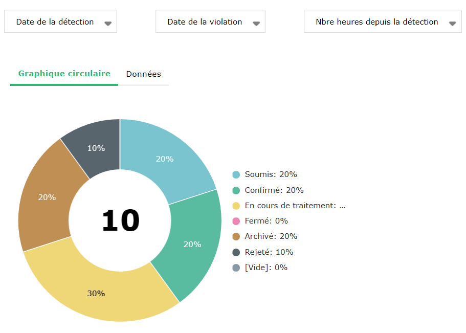 Ce rapport affiche l'ensemble des violations de données, groupées par statut, pour identifier facilement celles qui nécessitent une intervention immédiate.