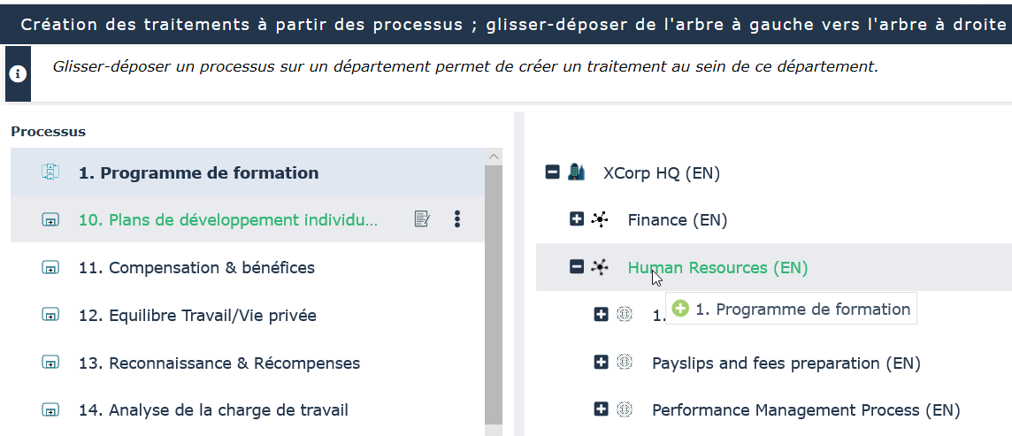 2. Sélectionnez un processus dans l'arbre de gauche et glissez-le dans l'arbre de droite sous un département spécifique.