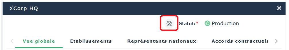 Lorsqu'un objet est modifié dans HOPEX, vous pouvez faire une synchronisation dans HOPEX Privacy Management. Dans la page de propriétés de l'organisation qui correspond à l'acteur modifié, le bouton Synchroniser est affiché.