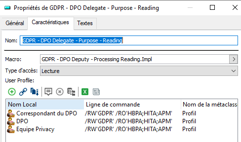 Ex. : la règle "GDRP - DPO Delegate - Purpose - Reading" s'applique aux MetaClasses Traitement et Transfert de données pour les profils Correspondant du DPO, DPO et Equipe Privacy.