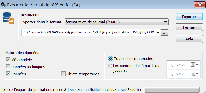 Pour sauvegarder le journal du référentiel sous forme d'un fichier de commandes :