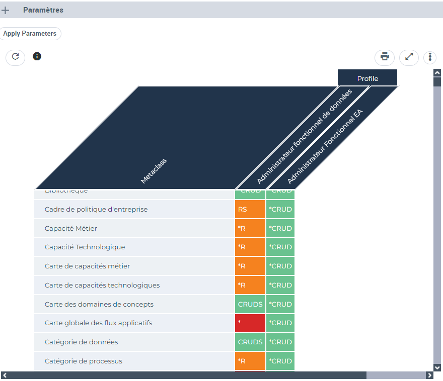 Ex. : rapport de comparaison des permissions des profils Gestionnaire de portefeuille applicatif vs Administrateur Fonctionnel de l'ITPM, ici les permissions d'une partie des MetaAttributes de la MetaClass Application.