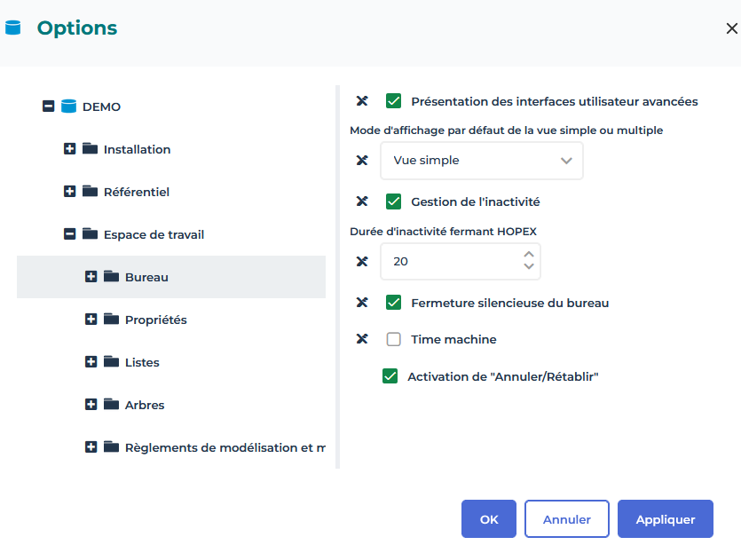 Dans le bureau d'Administration, les options d'HOPEX peuvent être configurées aux niveaux :