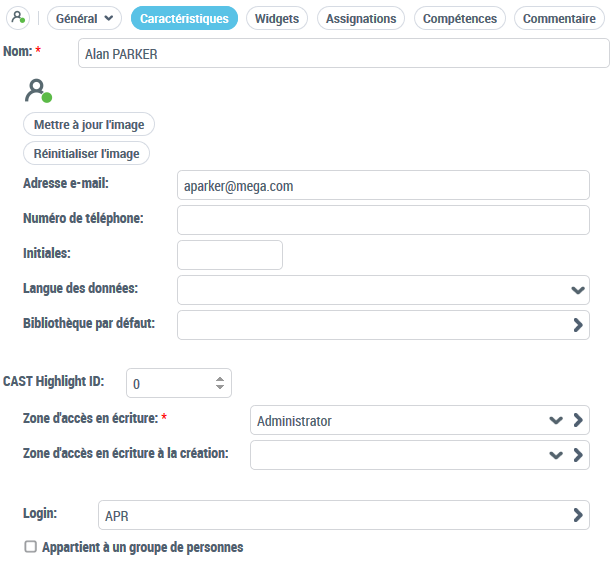 nom, zone d'accès en écriture, login et adresse e-mail sont renseignés et un profil est assigné à la personne.