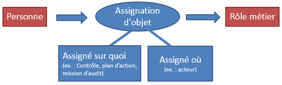 Des rôles métier sont assignés à des personnes ou à des groupes de personnes. L'assignation gère le lien entre la personne ou le groupe de personnes et son rôle métier.